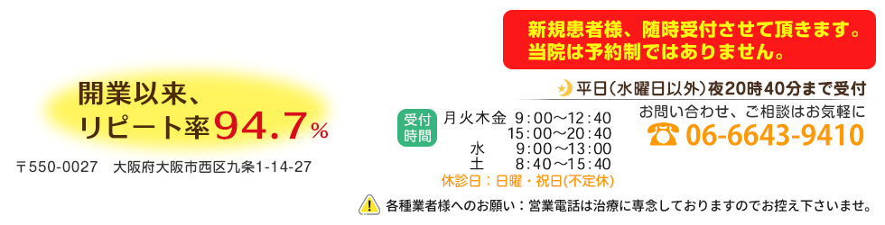 夜20時40分まで受付しておりますので、お仕事帰りなどでも通院して頂くことが可能です。