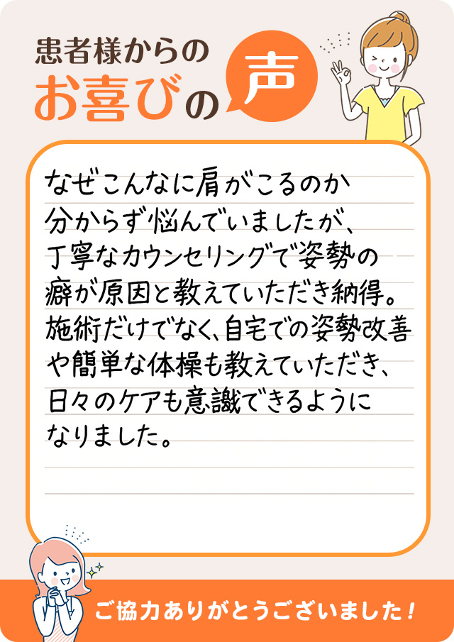 また、今後の通院、施術の方針などを分かりやすく説明いたします。